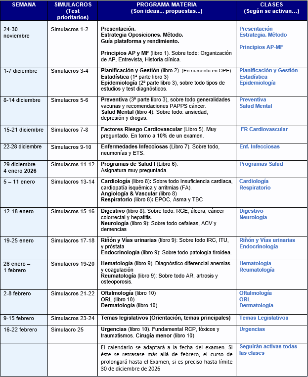calendario de trabajo, adaptado al programa de clases, pero es sólo eso, una propuesta, una forma de pautar el trabajo, por supuesto cada uno-a tiene que seguir el orden que considere más oportuno, organizarse como crea que le va mejor, y además lo ideal es tener en cuenta las preguntas que se vayan fallando para sacar más rentabilidad… Se flexible, si un determinado calendario o programa no funciona, cámbialo, y sólo hay una forma de saber si vamos bien o no, autoevaluarse, hacer exámenes, ver evolución y compararse con el grupo.